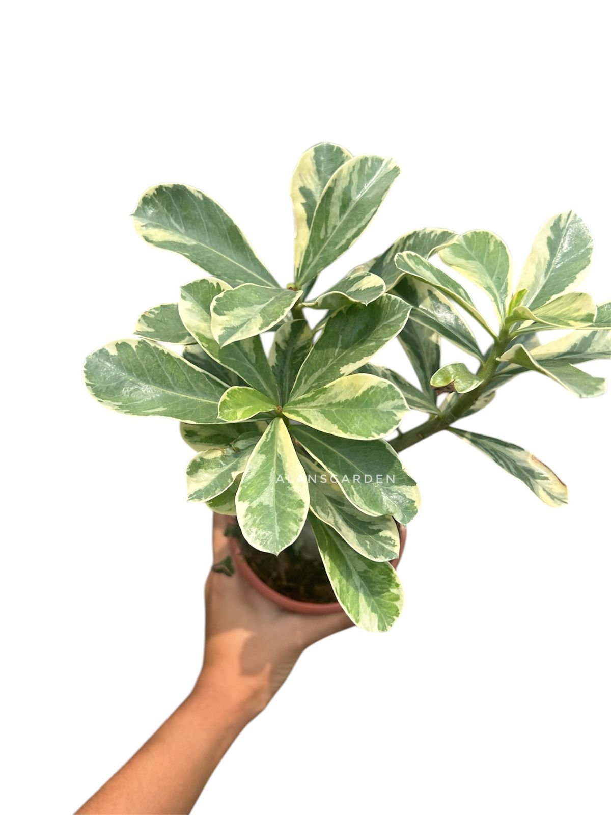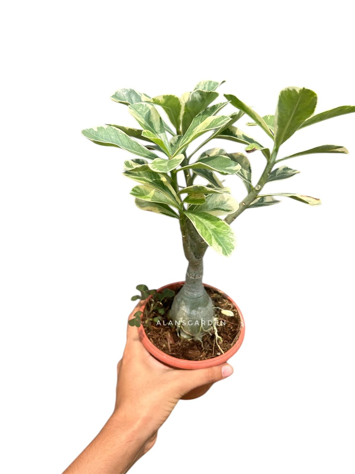 Variegated Adenium is a prized form of Desert Rose (Adenium obesum) with cream, yellow, white, or marbled foliage. Because leaves contain less chlorophyll, it grows slower and needs more careful watering/light balance than normal adeniums.