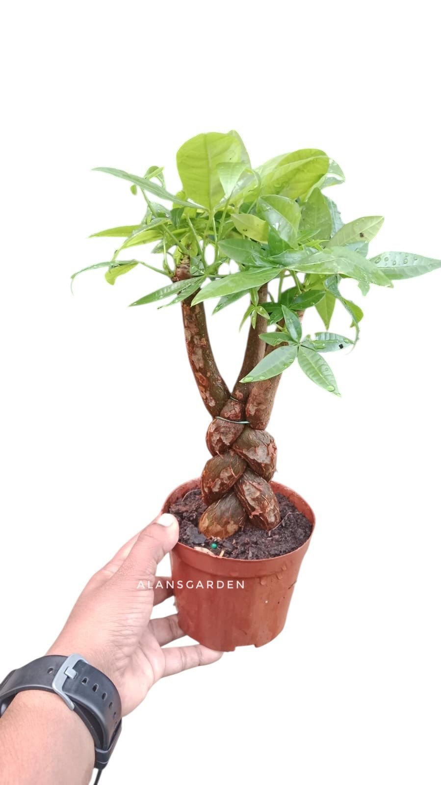The Braided Pachira Bonsai (Pachira aquatica), commonly known as the Money Tree Bonsai, is a stylish indoor plant admired for its braided trunk, lush green leaves, and easy-going nature. Each plant features multiple young stems woven together to form the iconic braid, symbolizing luck, prosperity, and positive energy. Its hand-shaped glossy leaves create a tropical appearance, making it an elegant decorative piece for homes and offices.